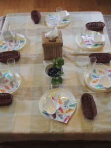 この日のテーブル。夏っぽくビーチサンダル柄のペーパーナプキン、主役のブルーベリーを飾って。