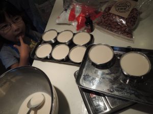 型に流します!残った生地は持ち帰り容器に入れ冷やすよ。