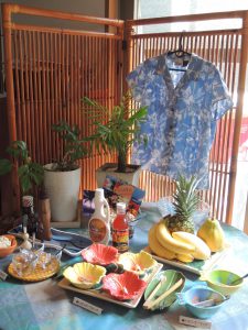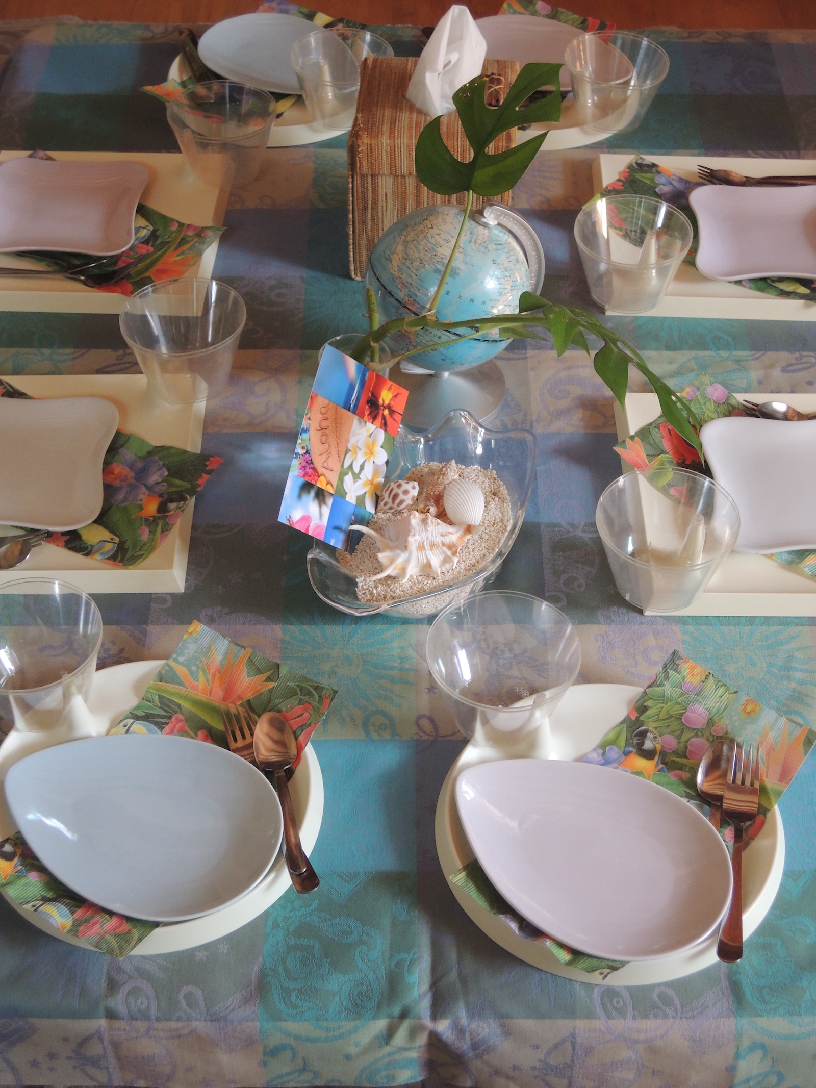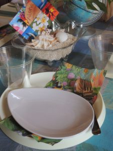 テーブルもハワイアンブルーに、熱帯植物や鳥のペーパーナプキンで。