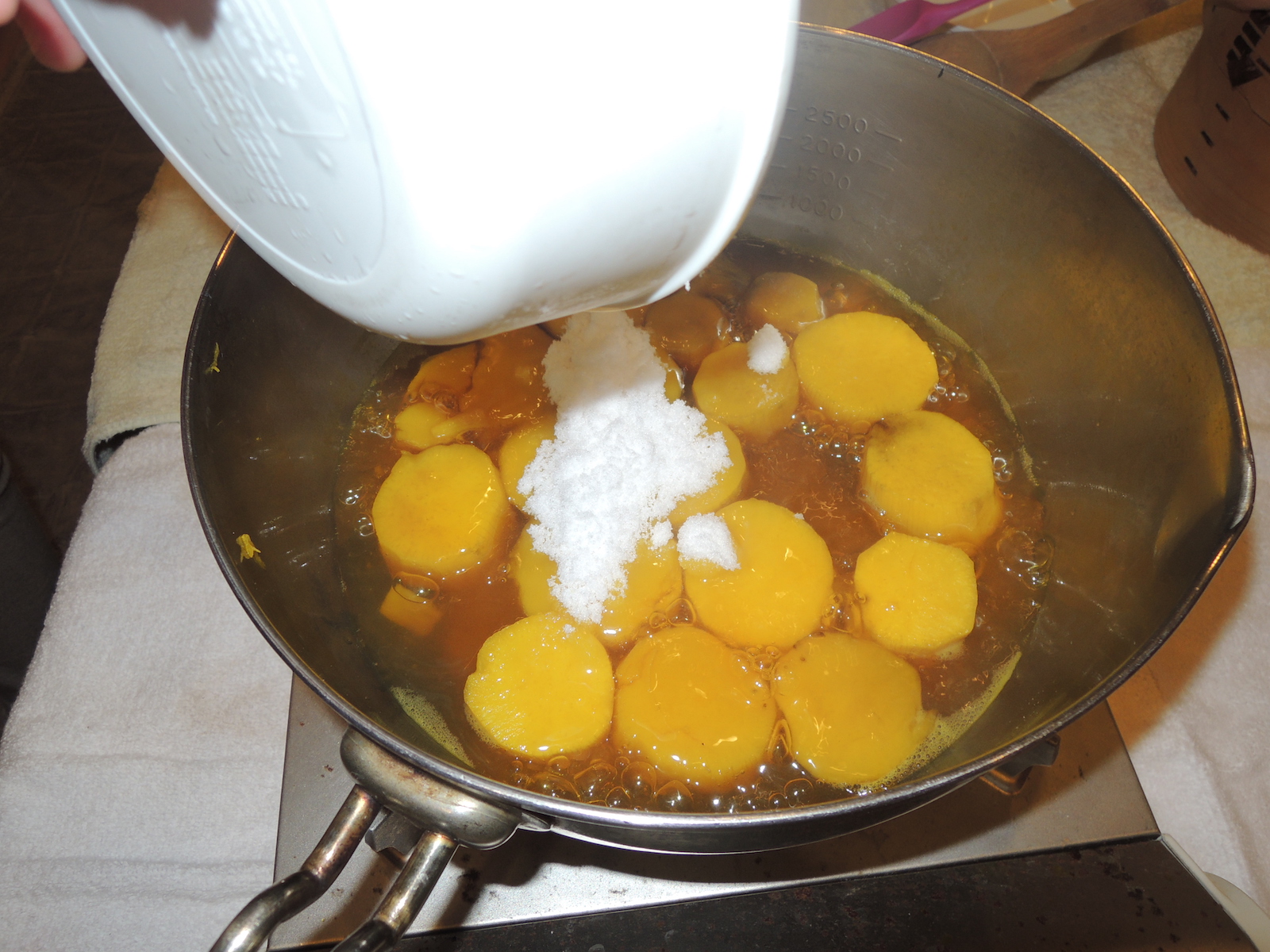 くちなしを叩いて、さつま芋を煮ます。