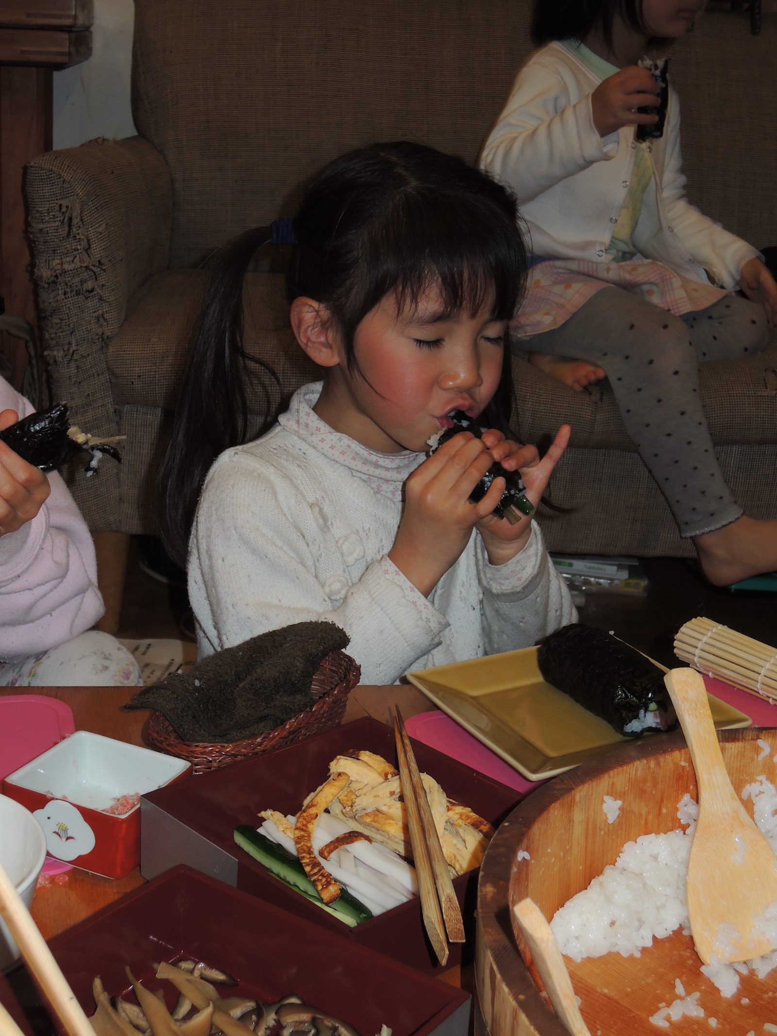 東北東を向いて一気食べ!小学生の食育で恵方巻