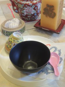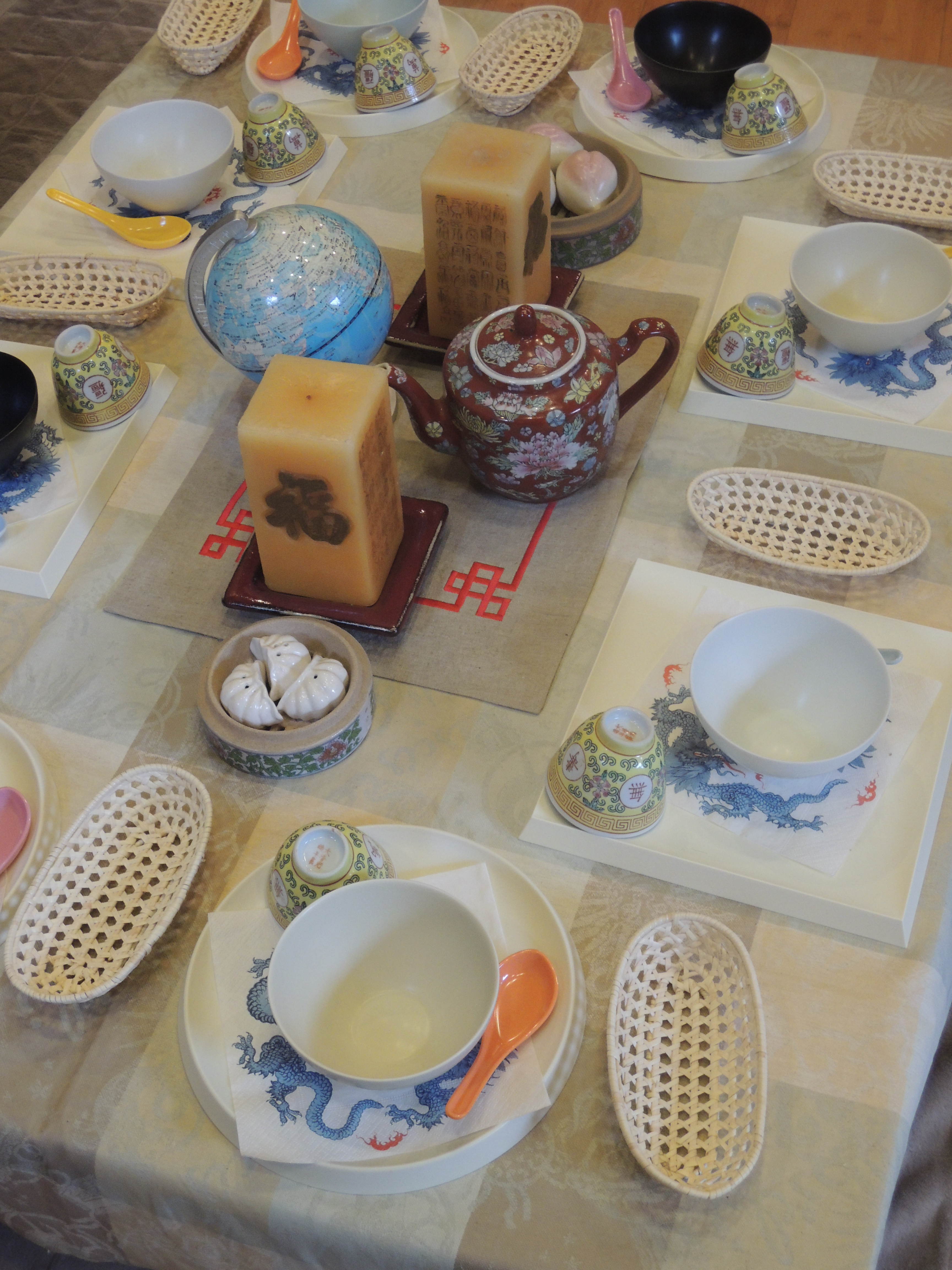 この日のテーブル、お正月らしく白のクロスに中華のテーブルマット&ポット。