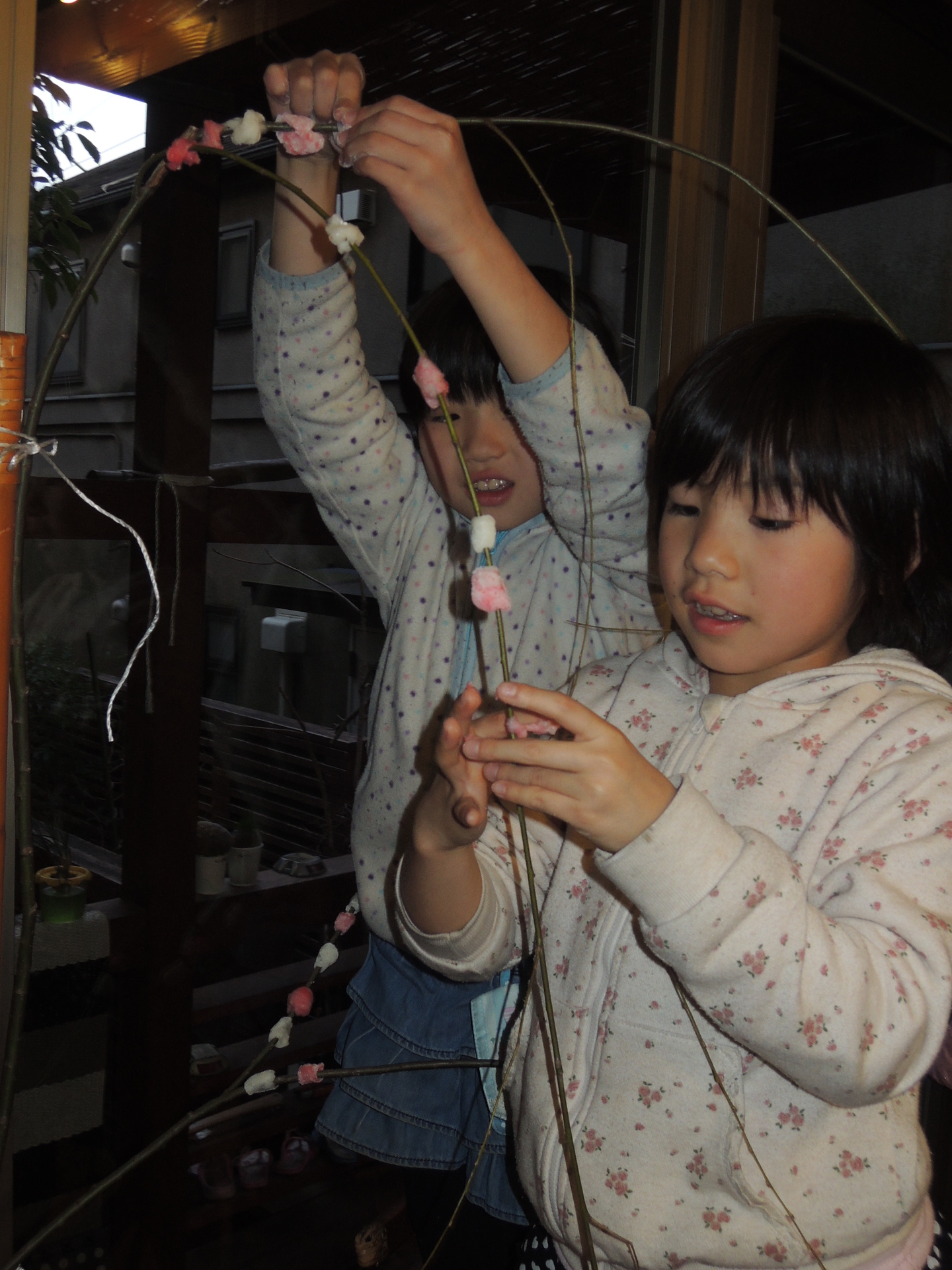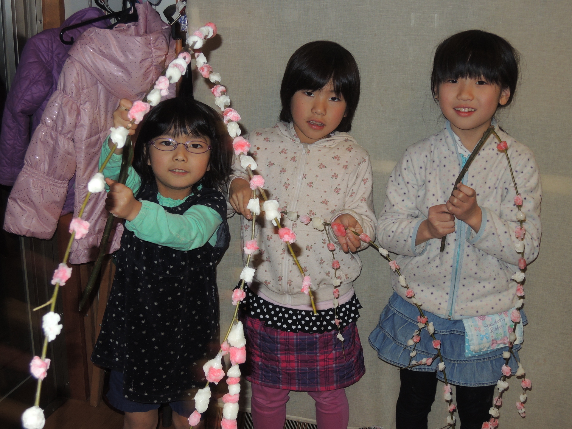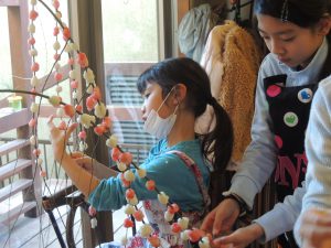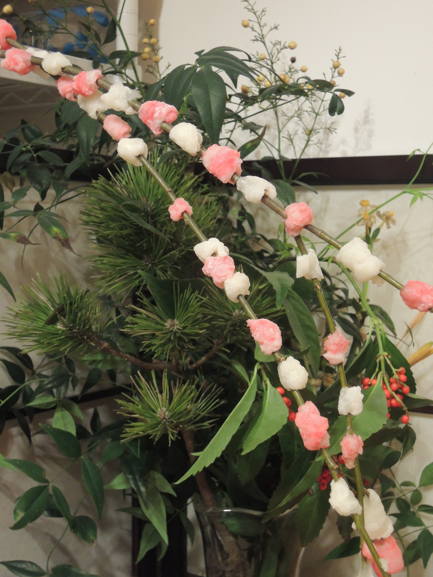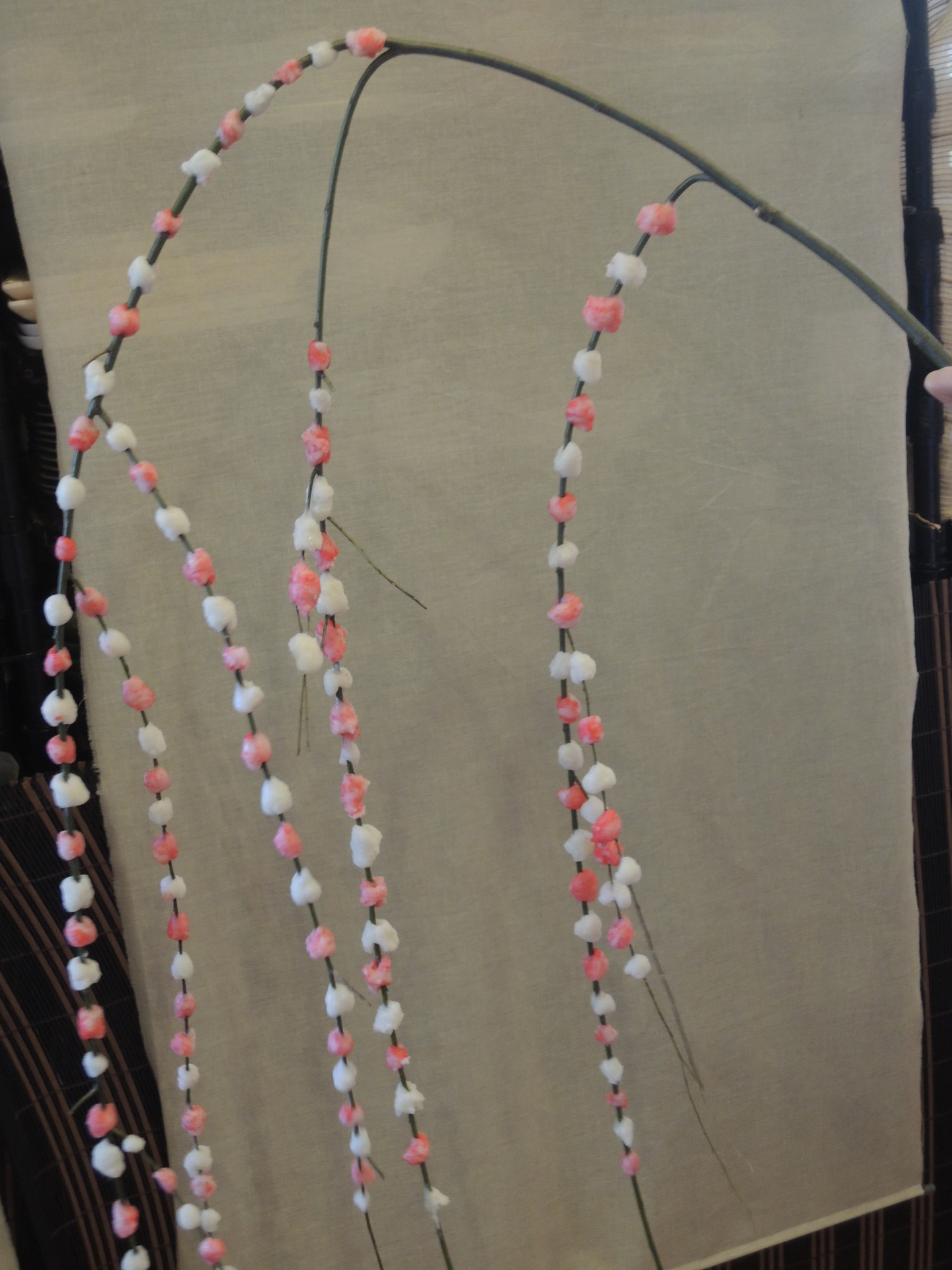 花餅とは、柳の枝に紅白のお餅を付け稲穂を表し、