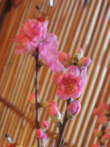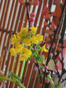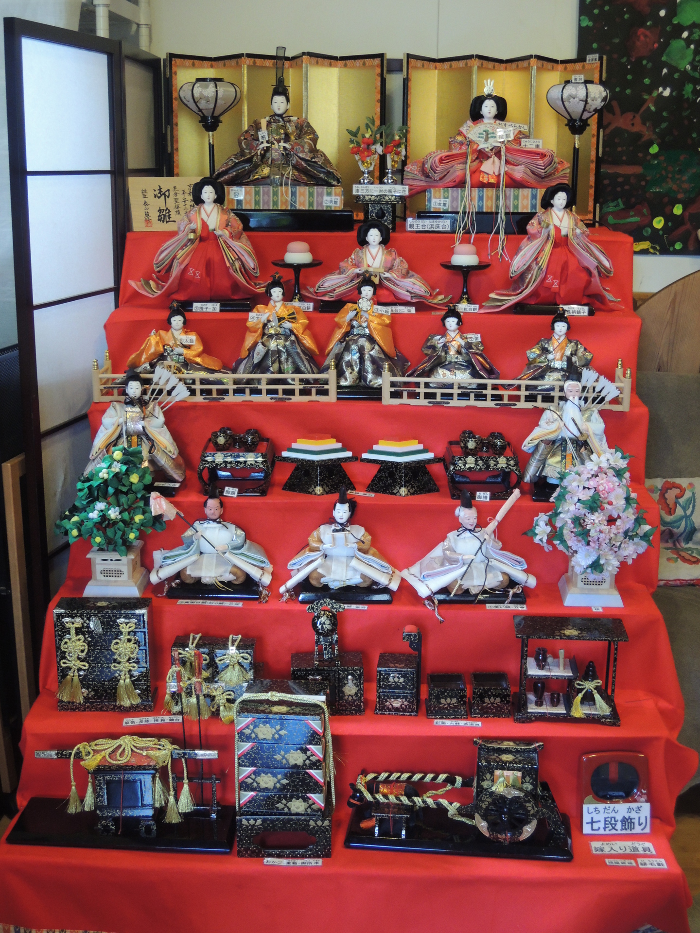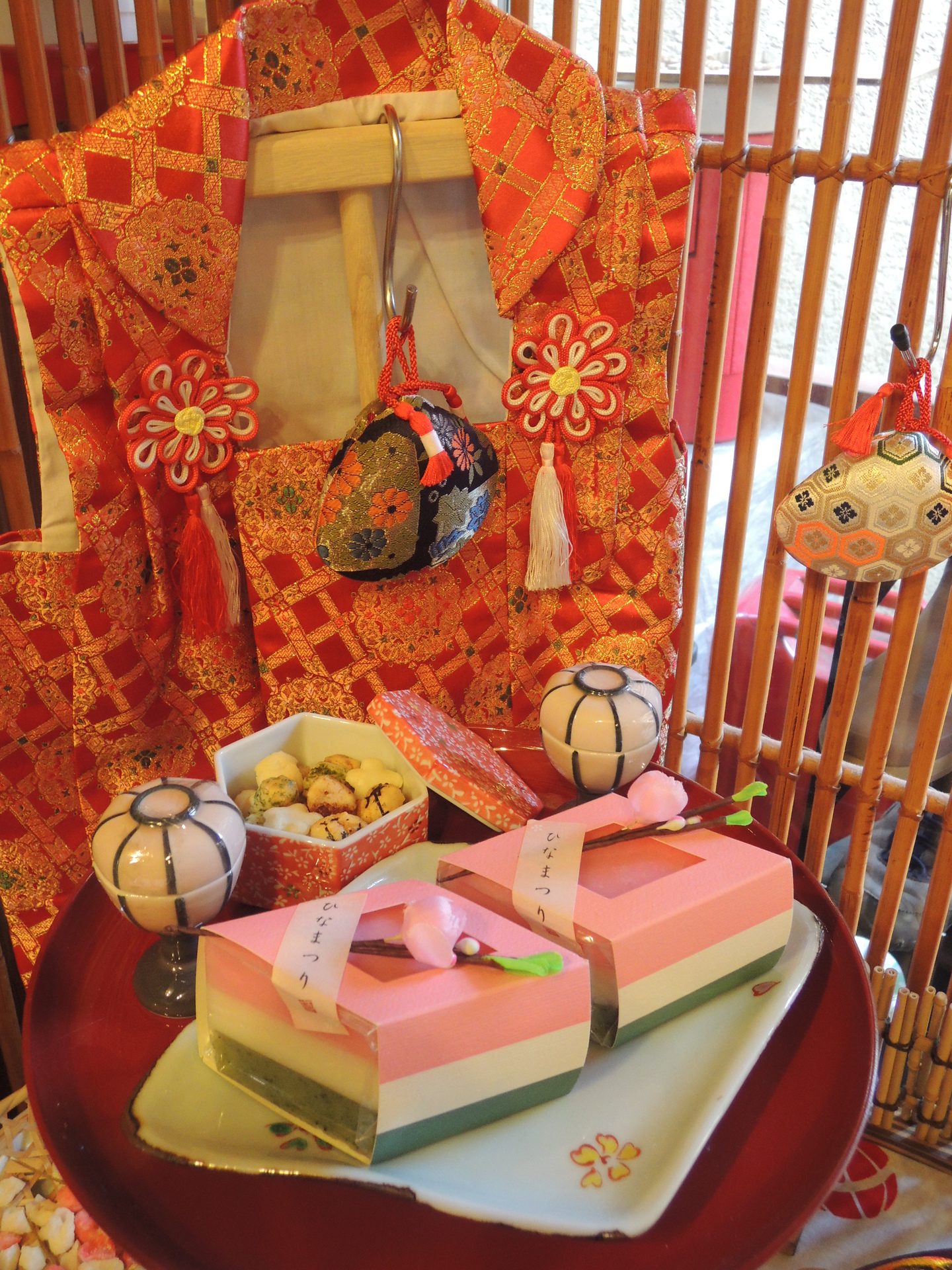七段飾りのお雛様、桃・菜の花、菱餅ひなあられを見ながら、
