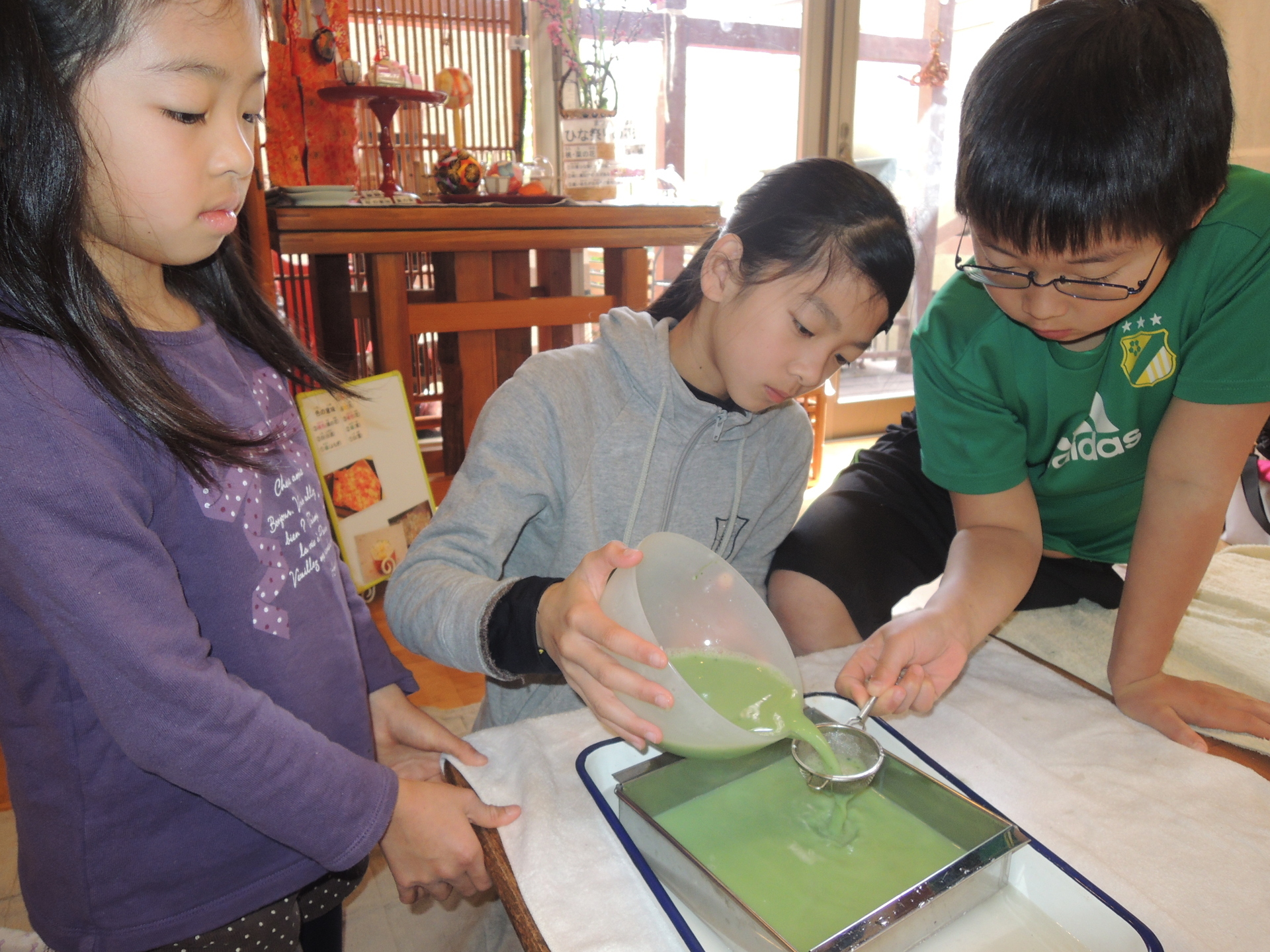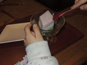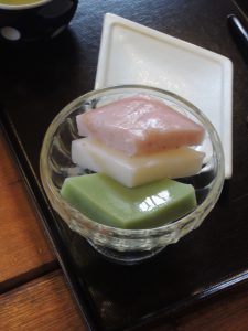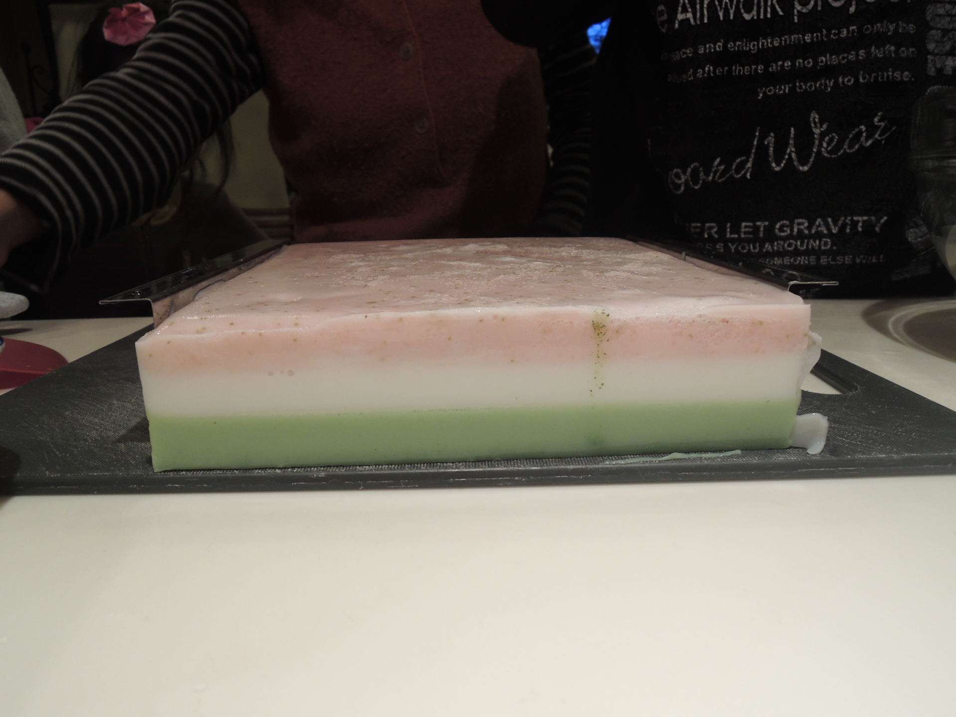 緑は抹茶・白は牛乳・ピンクはいちごで寒天を層にして作るのですが、