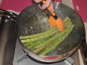 蕗は板ずりして茹で、皮をむきます。