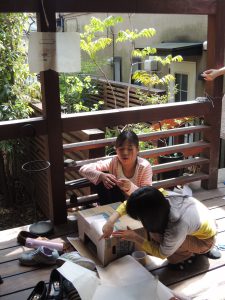 ママたちが料理している間、子供たちはダンボールで赤ちゃん猫ハウス作り!