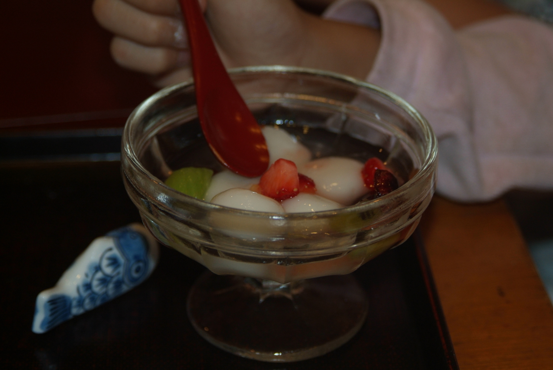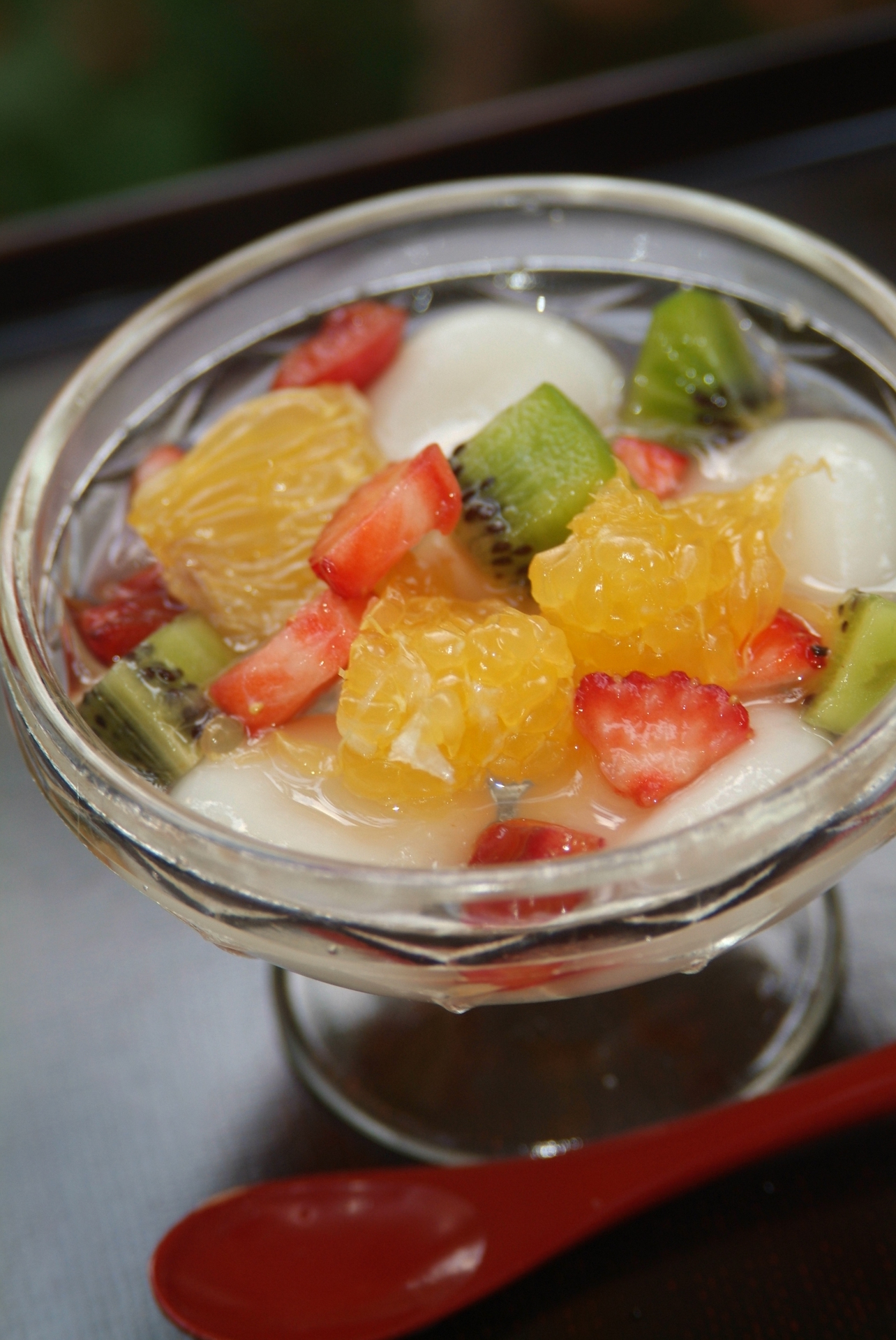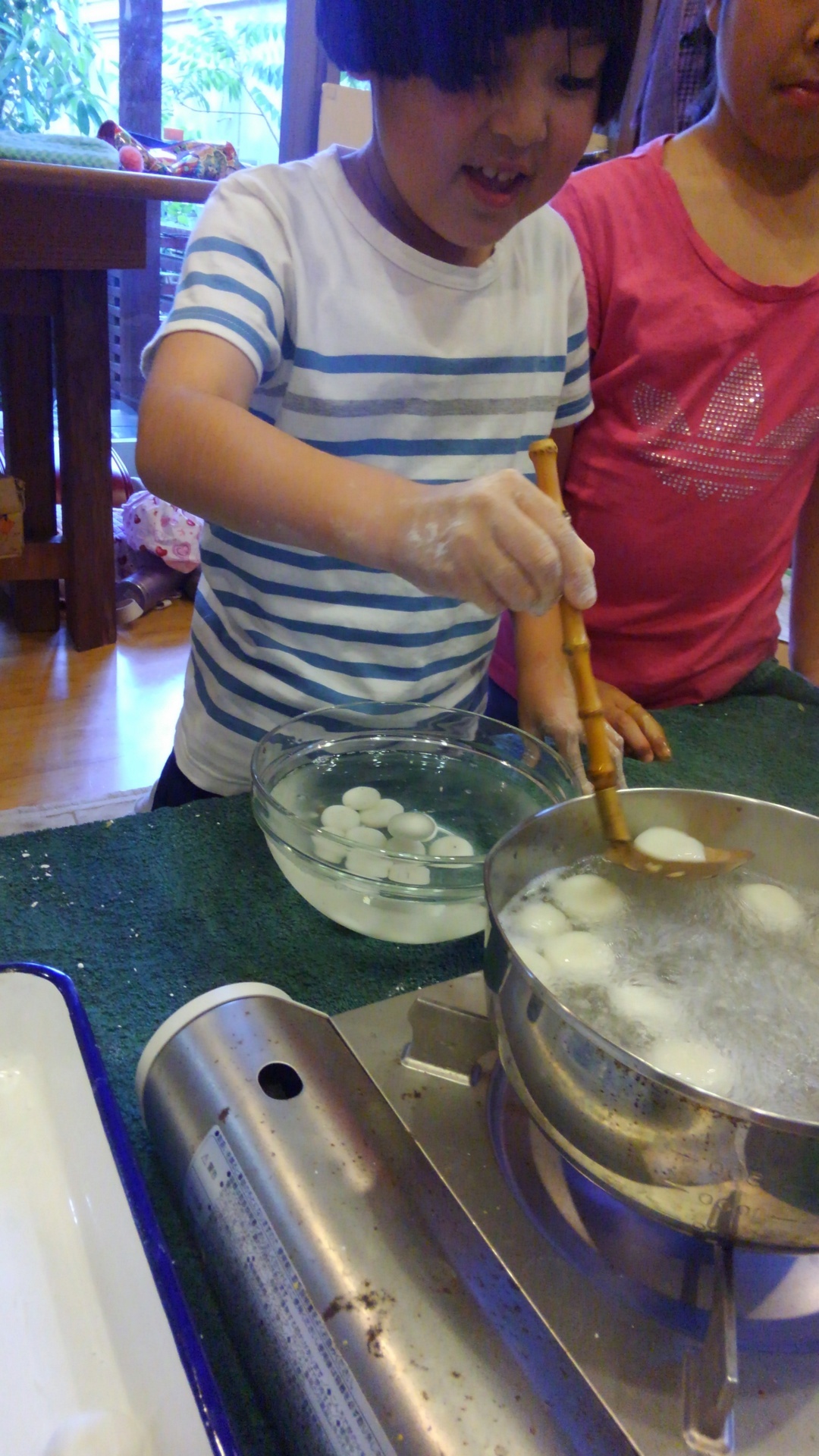 白玉こねて、フルーツ切って、丸めてゆでまーす。