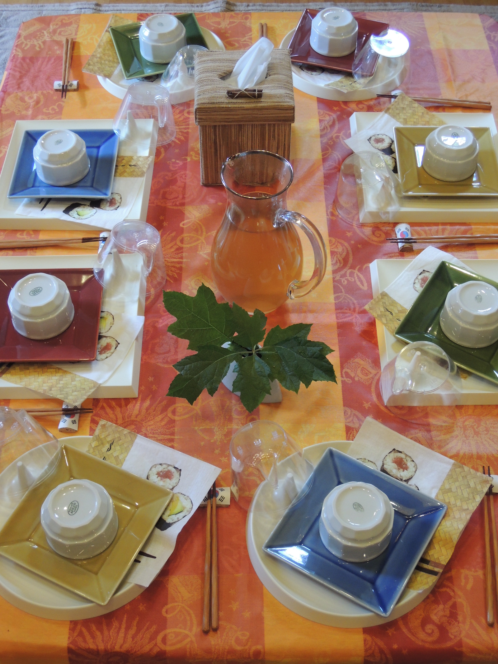 今日のテーブル、韓国式にお箸を縦置き、お箸置は韓国国旗。