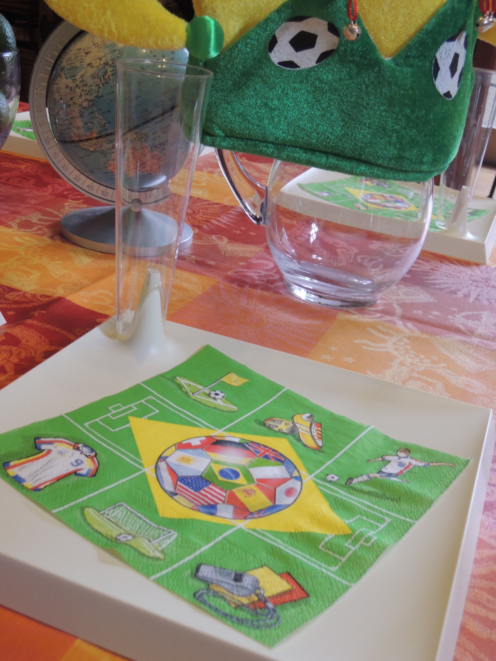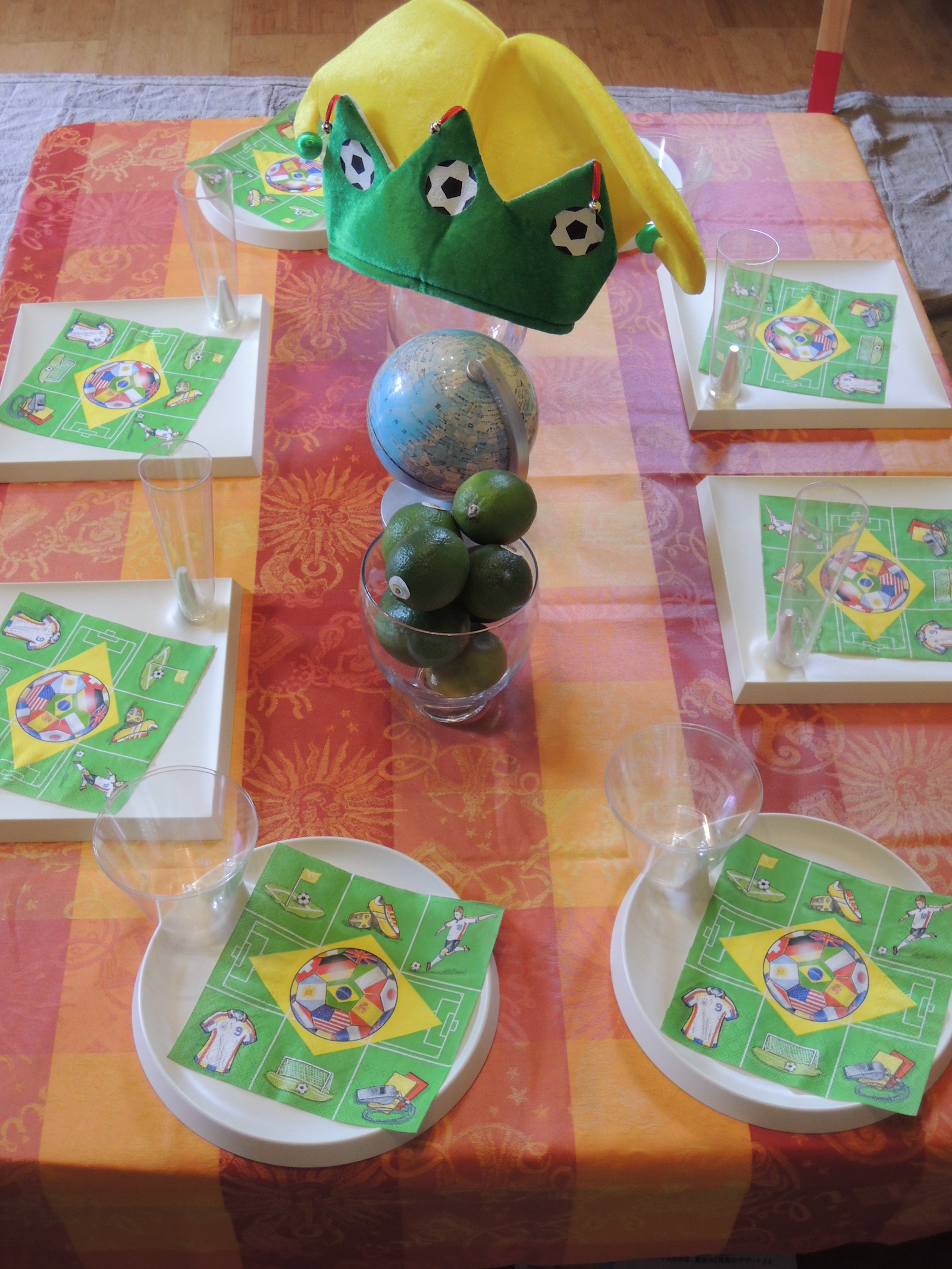 今日のテーブル、ペーパーナプキンはサッカーワールドカップ柄!