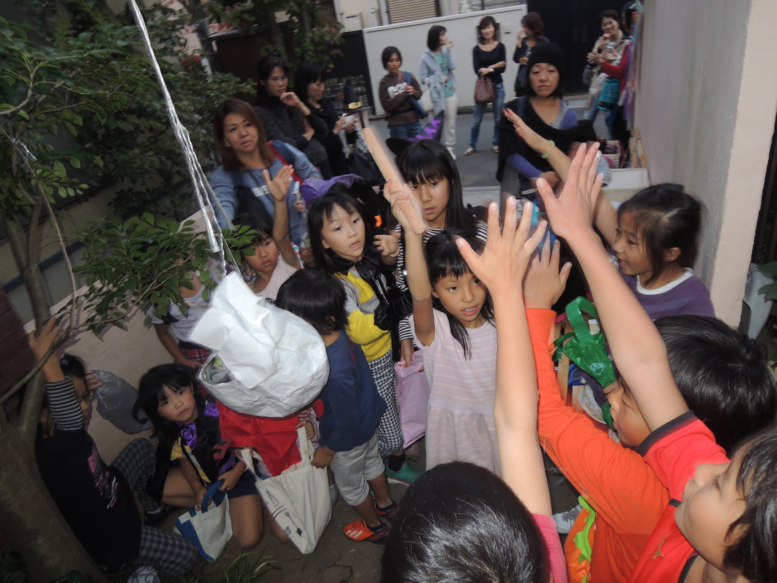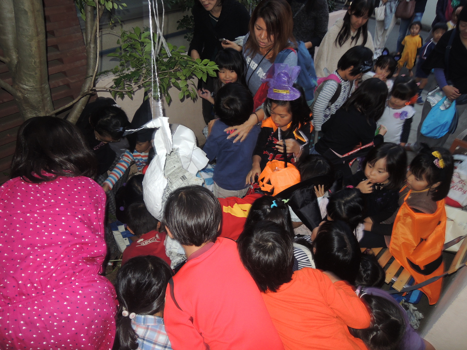 我が家のシマトネリコの木にピニャータをつるして行いました。