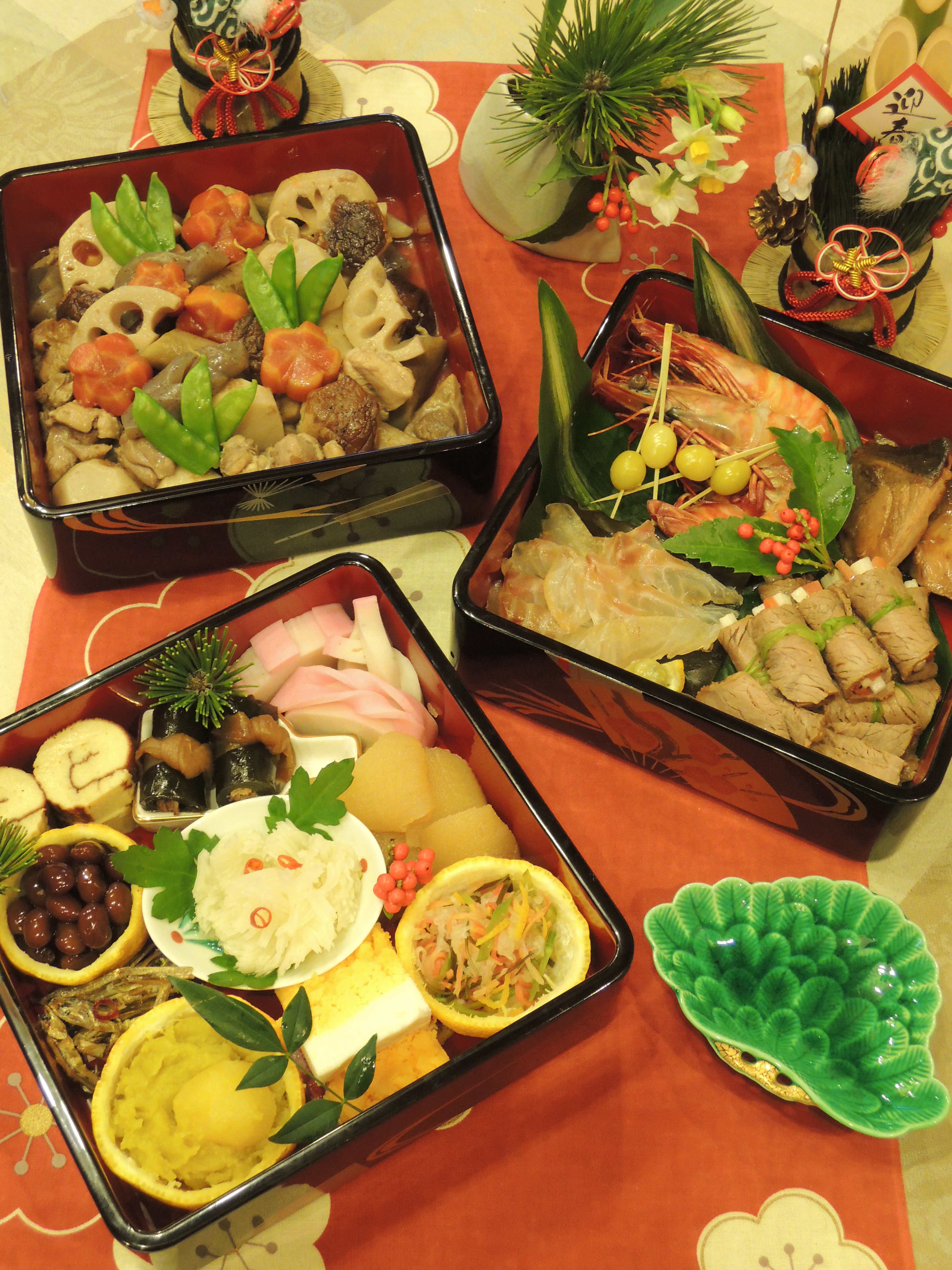黒豆、田作り、数の子、昆布巻、伊達巻、錦玉子、五色なます、結びかまぼこ三種、