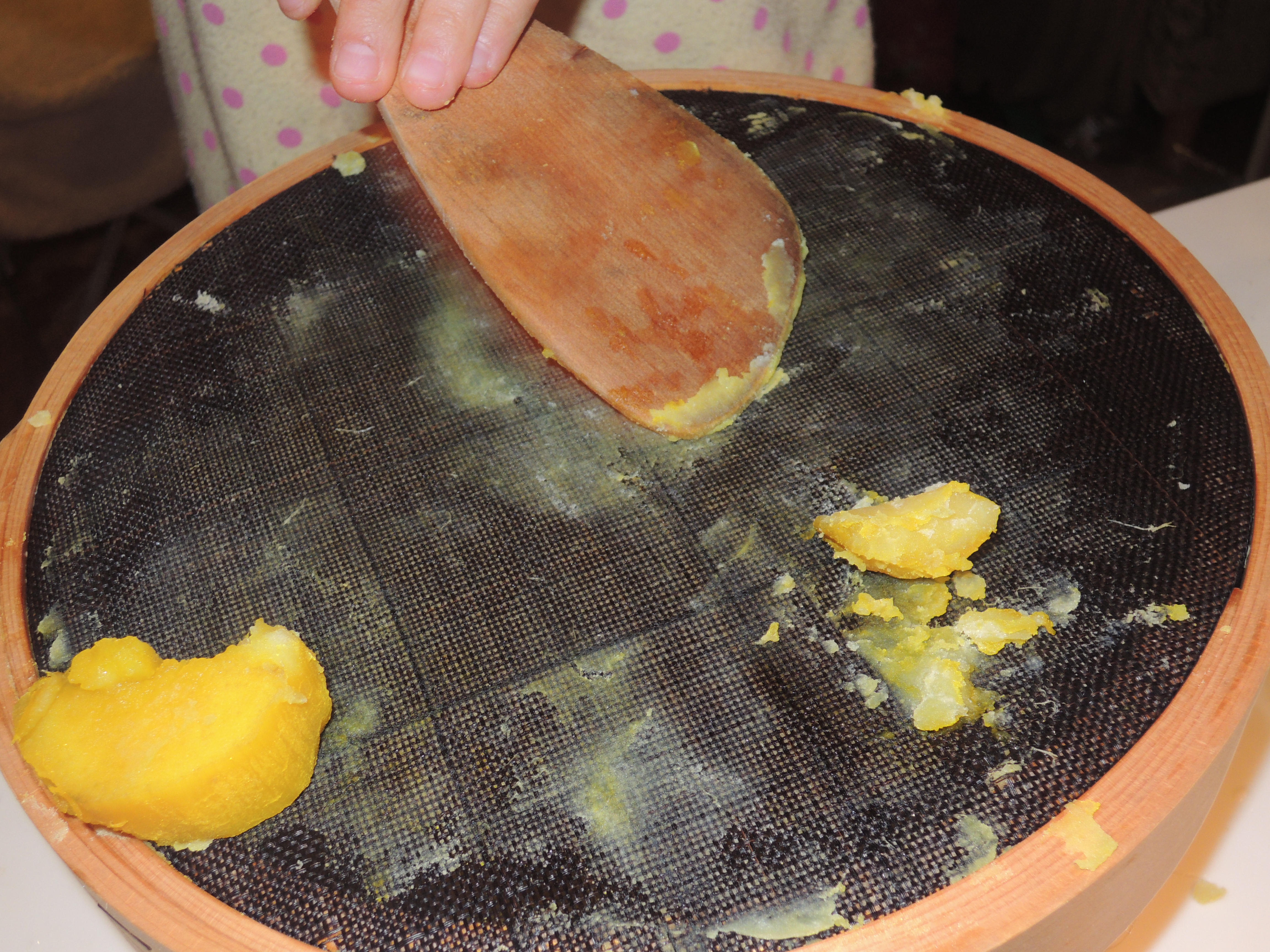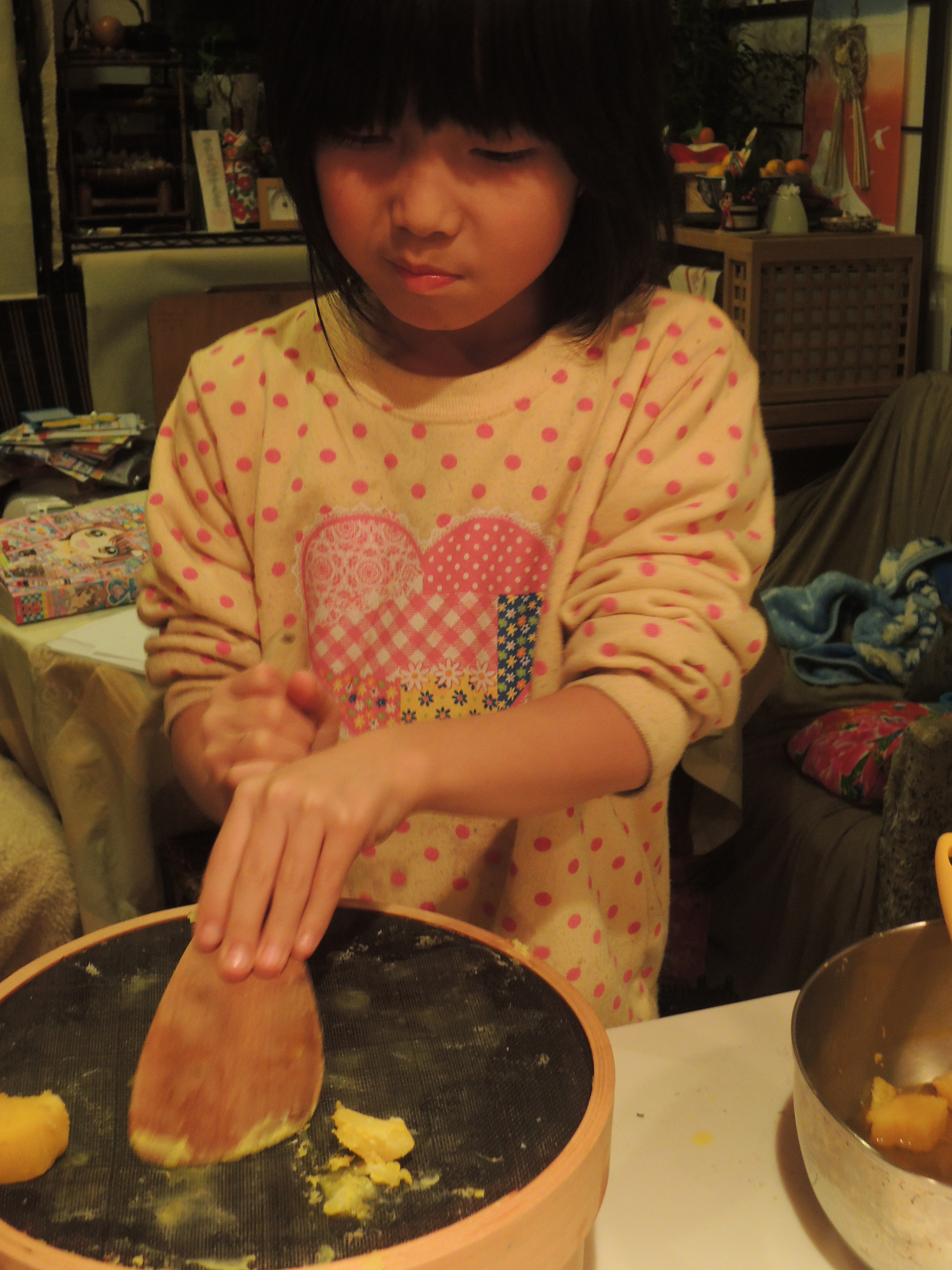 頑張ってさつま芋を裏ごす長女