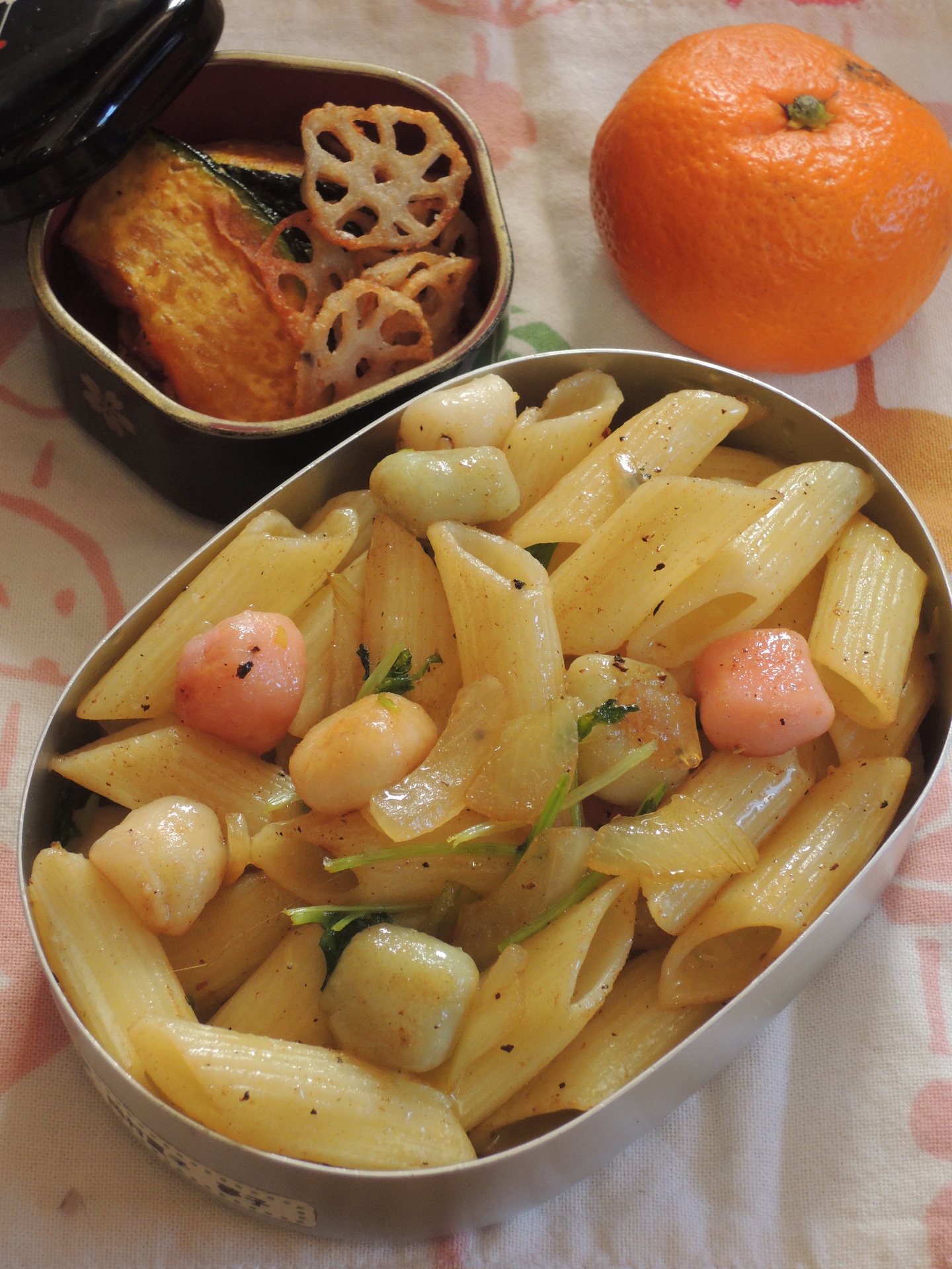 雛あられはんぺんと玉ねぎ・豆苗の和風ペンネ