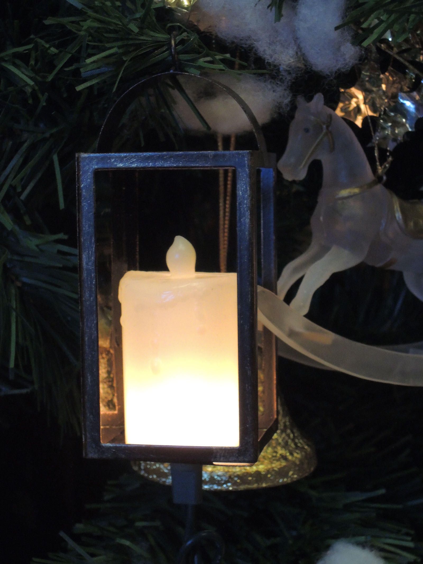 もみの木に、クリップタイプのキャンドル型の電気ツリーライトが飾ってありました。
