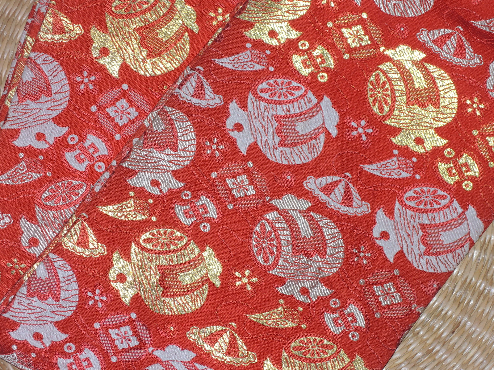 この帯は着物用というより、お祝い事の食卓のテーブルランナーとして購入。¥1,900。