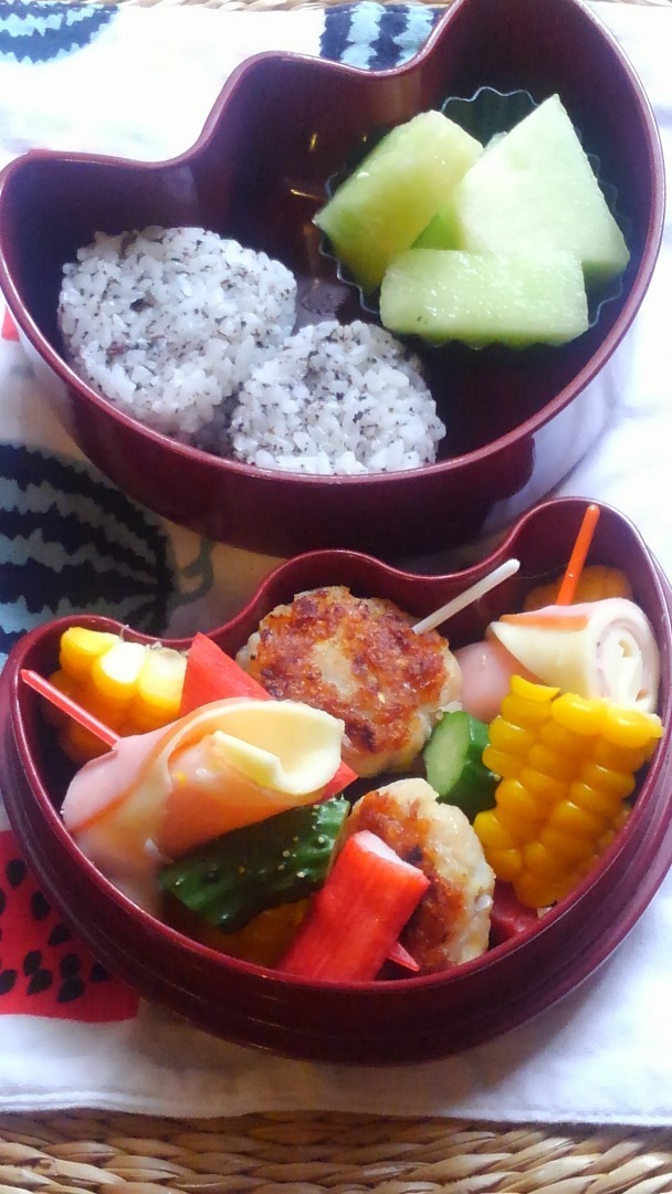 自家製ゆかりのおむすびに、デザートは長女・メロン、次女・桃。