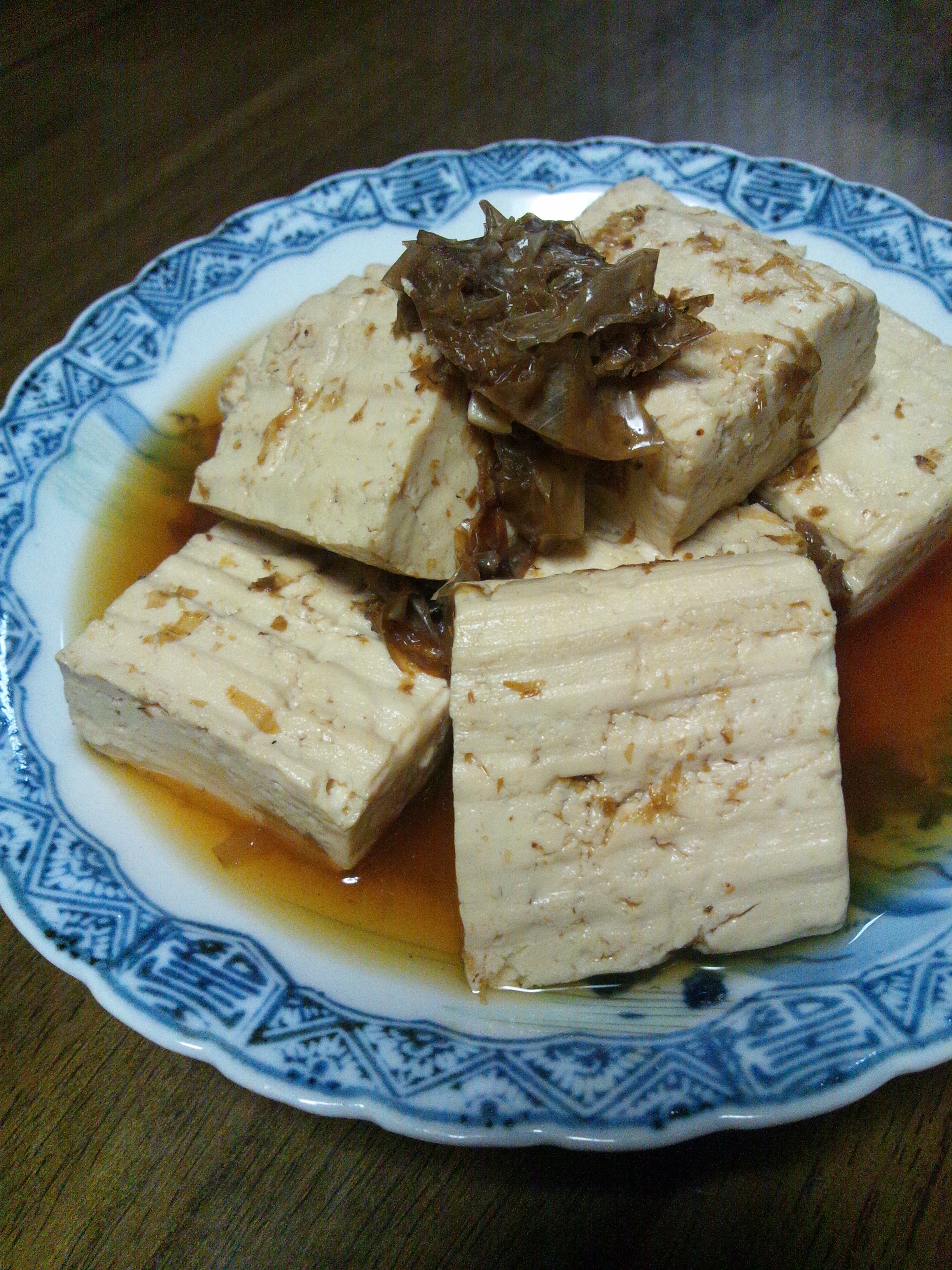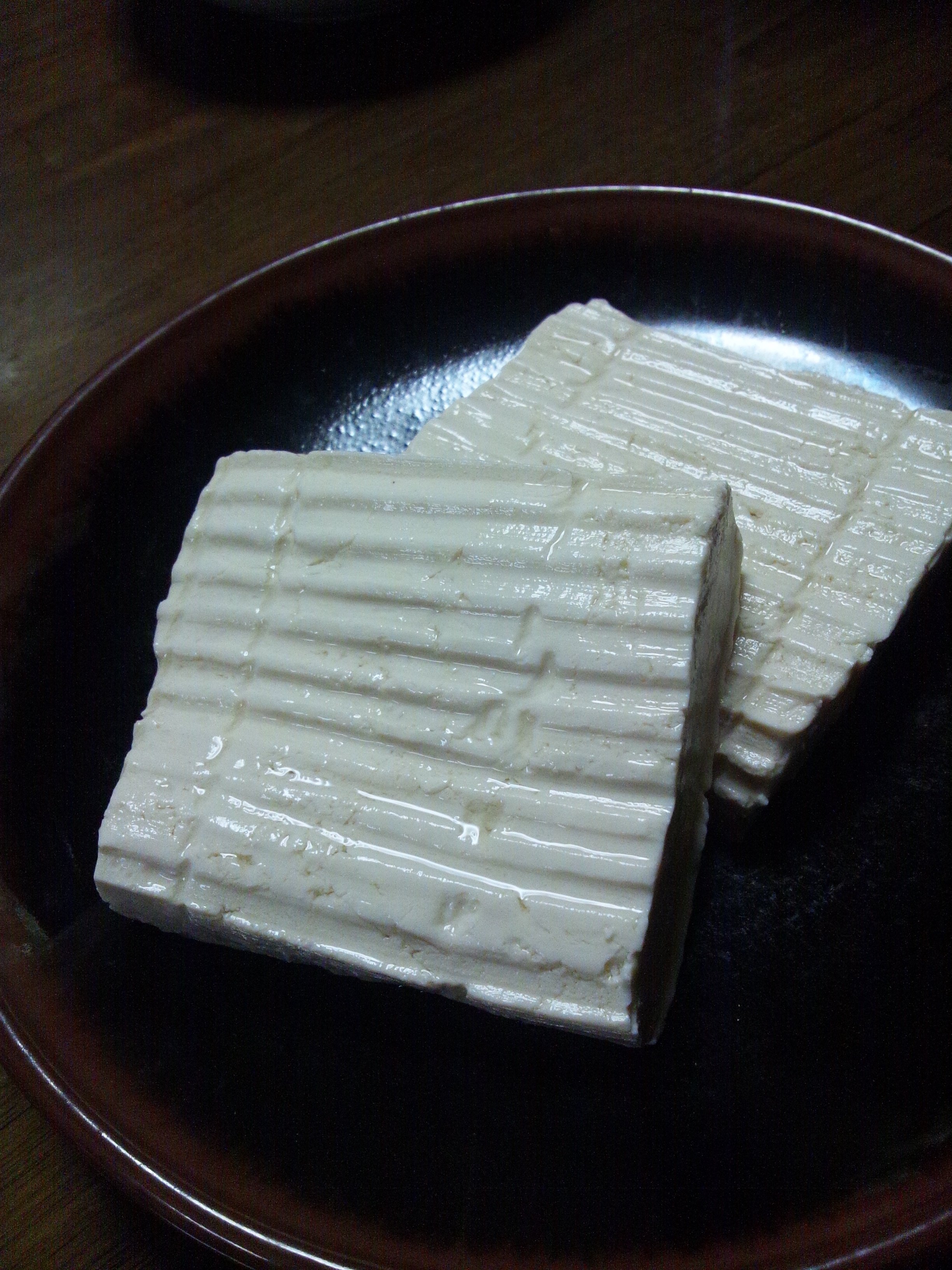この地方独特の真四角の豆腐を二枚におろして、いわゆる巻きすの様な物に包み、水を切って表面にデコボコな跡を付けた豆腐。