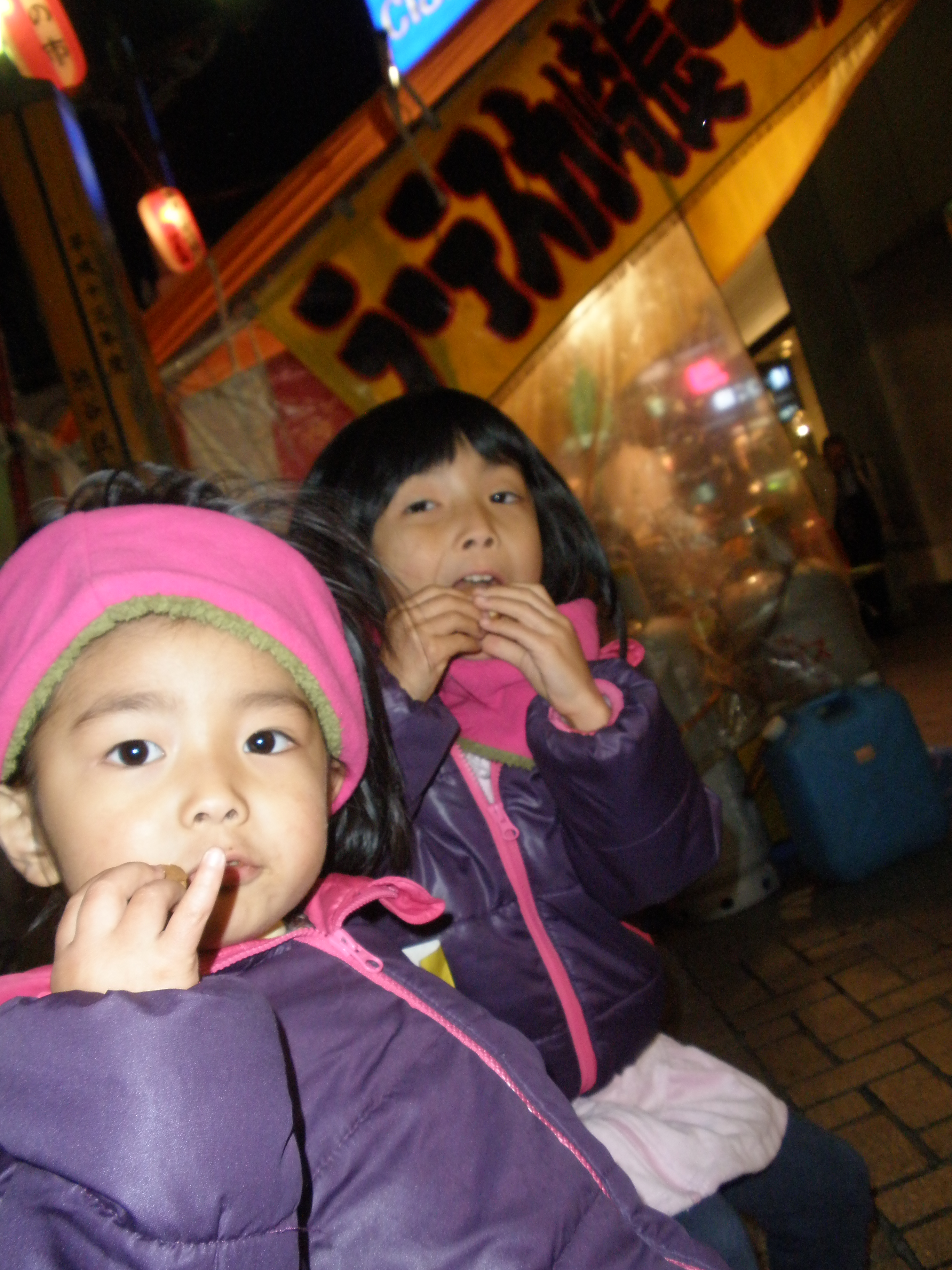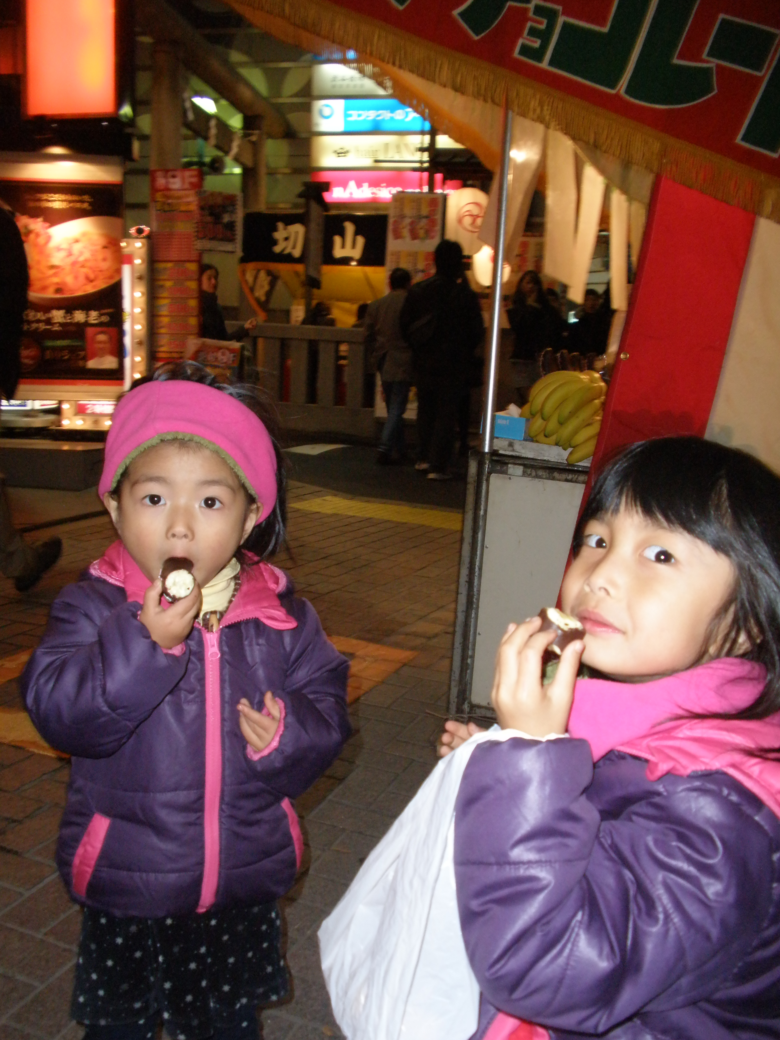 チョコバナナもベビーカステラも、ついでに串焼きも買って大満足の娘たち。
