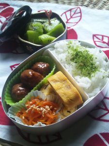 今日のお弁当、手作り派の私には珍しくイシイのミートボール入ってます。